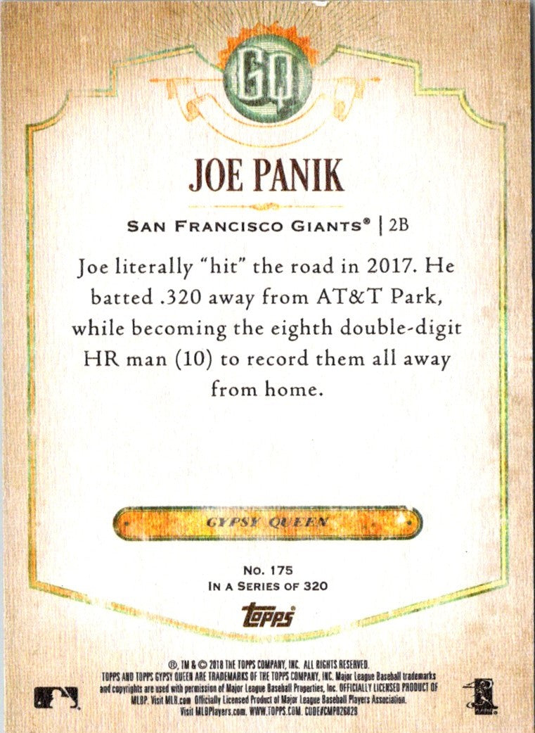 This 2018 Topps Gypsy Queen Joe Panik #175 is a must-have for any San Francisco Giants fan! Joe Panik is a key part of the Giants line-up and this card captures him in mid-swing, showcasing the power and accuracy of his bat. The card is printed on premium card stock and features a full color action photo on one side with detailed stats and career highlights on the reverse. Add this card to your collection and you'll have a piece of memorabilia that you'll treasure for years to come.