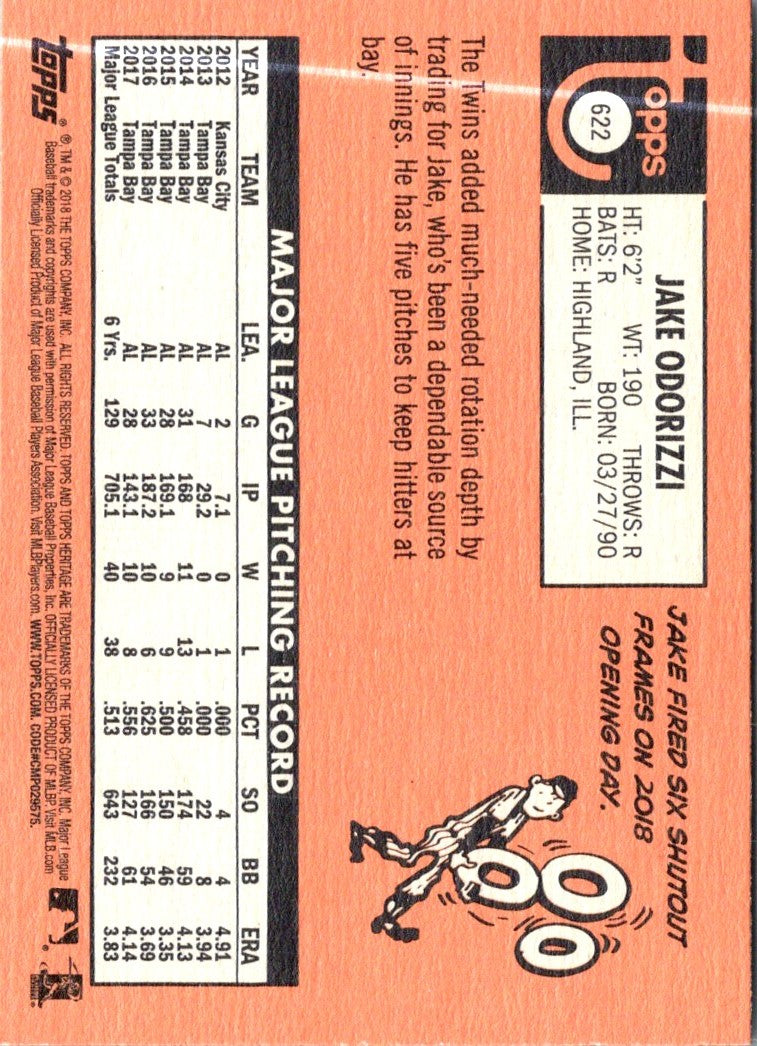 The 2018 Topps Heritage Jake Odorizzi #622 Minnesota Twins card is the perfect addition to any baseball fan's collection! Featuring a replica of the 1954 Topps design, the card features an action shot of Odorizzi in his Twins uniform. The card is a great way to commemorate Odorizzi's amazing 2018 season and his impact on the Minnesota Twins. It is a must-have for any true Twins fan, and perfect for any collector of modern and vintage baseball cards. Add this unique card to your collection today!