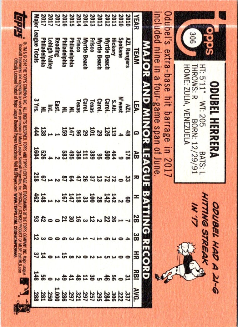 This 2018 Topps Heritage Odubel Herrera #306Philadelphia Phillies card is a must-have for any Phillies fan! It features a high-quality image of the Phillie's Odubel Herrera in action. The card's classic design is reminiscent of the traditional Topps baseball cards of the past. It also features stats and career highlights from Herrera's 2017 season. This card is a great way to add a collectible piece of Phillies history to your collection!