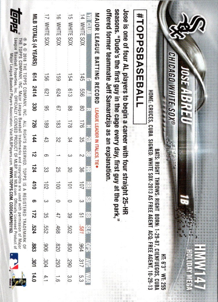 The 2018 Topps Holiday Jose Abreu card is a must-have for all Chicago White Sox fans. This iconic card showcases the White Sox slugger at his best, with a bold design that captures the spirit of the game. The card features a full-color photo of Abreu in action, along with his name and team logo. The back of the card provides Abreu's vital stats and a brief biography. This card is a great addition to any White Sox fan's collection, and a great way to honor the team's star player.