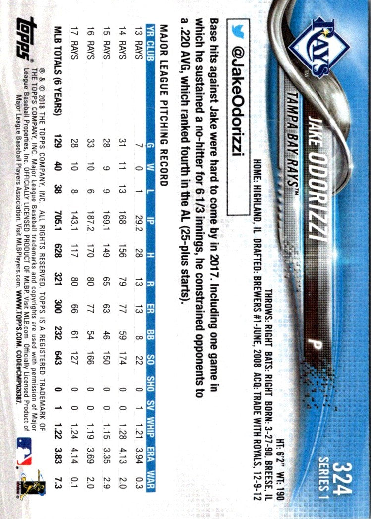 2018 Topps Jake Odorizzi #324 Tampa Bay Rays is a must-have for any fan of the Rays. This card features a full-color photo of Odorizzi in his Rays uniform on the front and a full statistical breakdown of his 2017 season on the back. This card is a great way to show your support for the Rays and your admiration for Odorizzi as one of the team's top pitchers. Add this card to your collection and show your Rays pride!