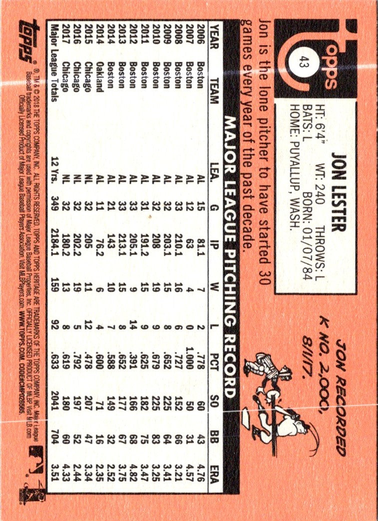 The 2018 Topps Jon Lester #43 Chicago Cubs card is a must-have for any Cubs fan! Featuring a bold portrait of the pitcher in his signature blue Cubs uniform, this card is a great way to commemorate the career of one of the team's all-time greats. With vibrant colors and sharp detail, the card is sure to be a standout in any collection. A great way to show your support for the Cubs, and celebrate the career of one of their all-time best!