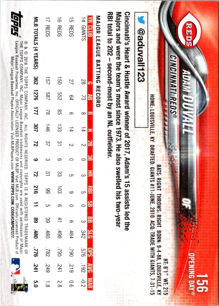 Hit the diamond with one of the National League's brightest stars, Adam Duvall, with 2018 Topps Opening Day! This base card features a vivid head shot of the Cincinnati Reds slugger, and is perfect for any Reds fan or baseball card collector. With a career batting average of .271, Duvall continues to be a powerful force in the Reds lineup. Don't miss this chance to add this card to your collection and show your support for Adam Duvall and the Cincinnati Reds!
