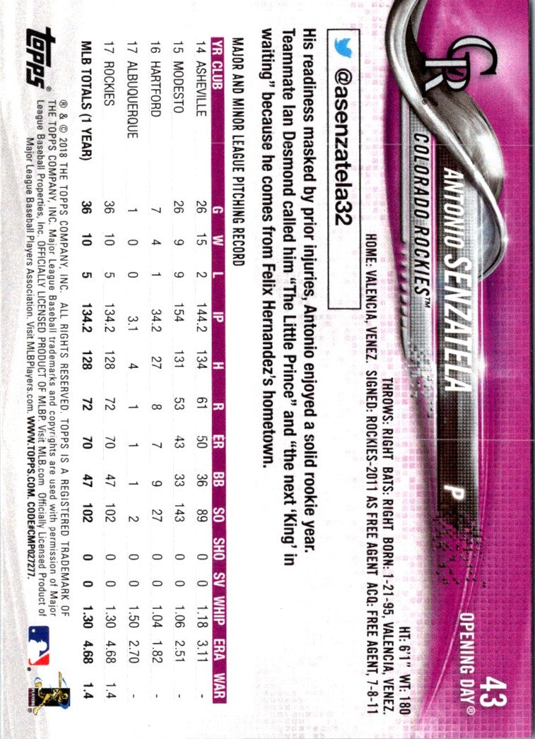 2018 Topps Opening Day Antonio Senzatela #43 Colorado Rockies is the perfect addition to any Rockies fan's collection. Featuring a vibrant and iconic image of Senzatela in his Rockies uniform, this card is sure to be a hit with any baseball enthusiast. It's a great way to honor the pitcher's contribution to the team and to show off your Colorado Rockies pride. Get your hands on this card today and add it to your collection!