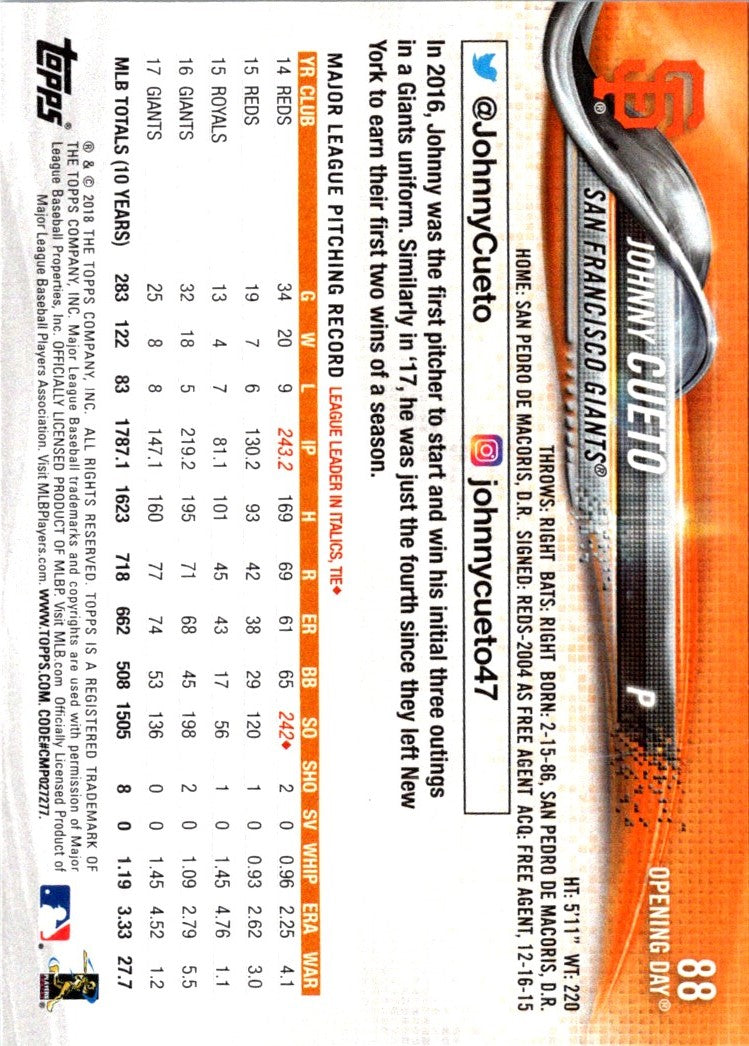 Show your San Francisco Giants pride with this 2018 Topps Opening Day Johnny Cueto #88 card! With an iconic photograph of Cueto in his Giants uniform, this card is an essential for any Giants fan. Featuring a colorful design with the team logo, this card is sure to stand out in your collection. A great way to commemorate a legendary season for the Giants, this card is a must-have for any collector. Get your hands on this card today and take your Giants fandom to the next level!