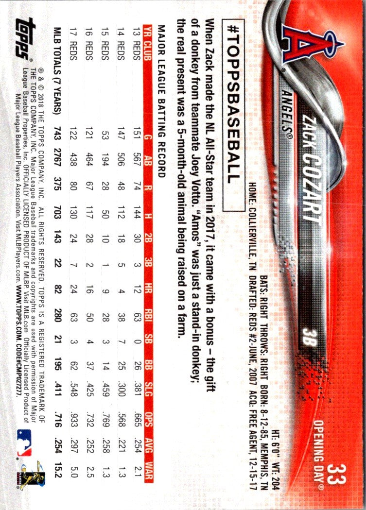 This 2018 Topps Opening Day Zack Cozart #33 Los Angeles Angels card is an exciting addition to any Angels fan's collection! This card features a stunning photo of Zack Cozart in action for the Los Angeles Angels on the front, complete with bold team colors and logo. The back of the card includes all of the relevant statistics and career highlights from the 2017 season. This is a must-have for any collector of Angels memorabilia!