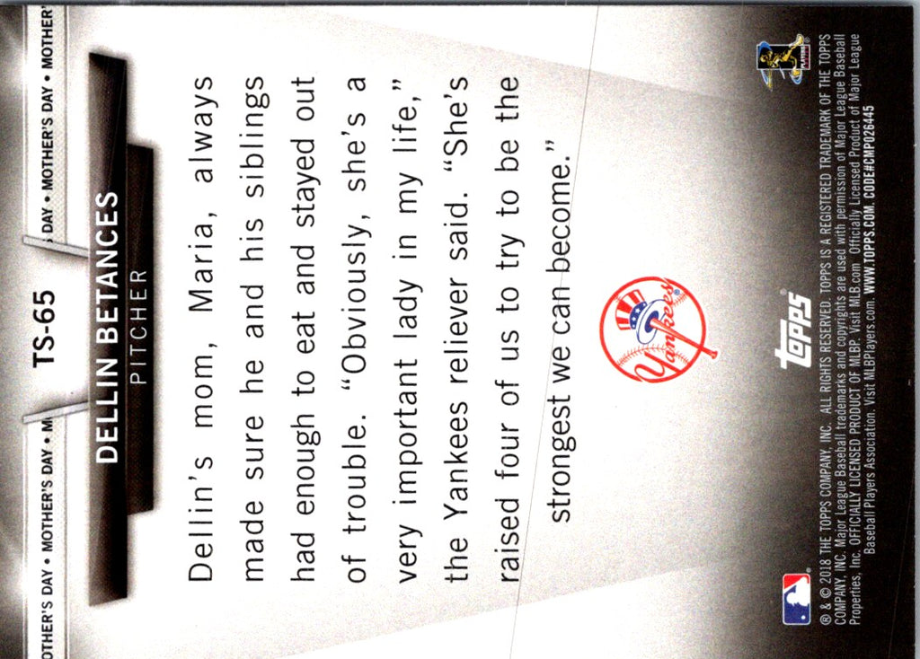 The 2018 Topps Salute Dellin Betances #TS-65 card celebrates the career of this three-time All-Star relief pitcher for the New York Yankees. The detailed design features a color portrait of Betances in a Yankees uniform, as well as a Yankees logo and a quote from the All-Star pitcher. This is a must-have for any fan of the Yankees or Betances himself. Get your hands on this card and add it to your collection today!