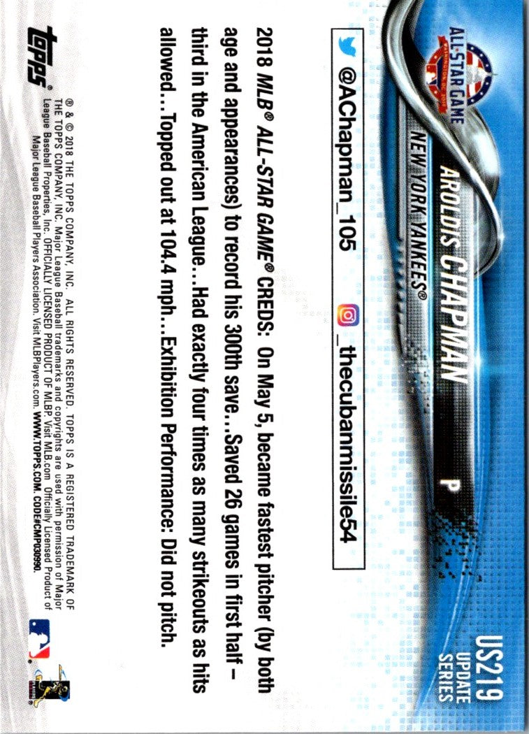 Featuring 2018 Topps Update Aroldis Chapman, this card celebrates the star pitcher of the New York Yankees. The card showcases a vibrant photo of Chapman in his Yankees uniform, with a vibrant blue background. The card features Chapman's name and team logo, and a modern design. Collectors will love adding this card to their collection, and it's sure to become a classic.