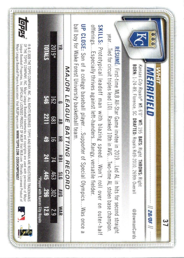 This 2019 Bowman Whit Merrifield #49 card is a must-have for Kansas City Royals fans. Showcasing the Royals' star player, this card features a glossy image of Whit Merrifield, along with his vital stats and team logo. Add this card to your collection today and show your pride for the Kansas City Royals.