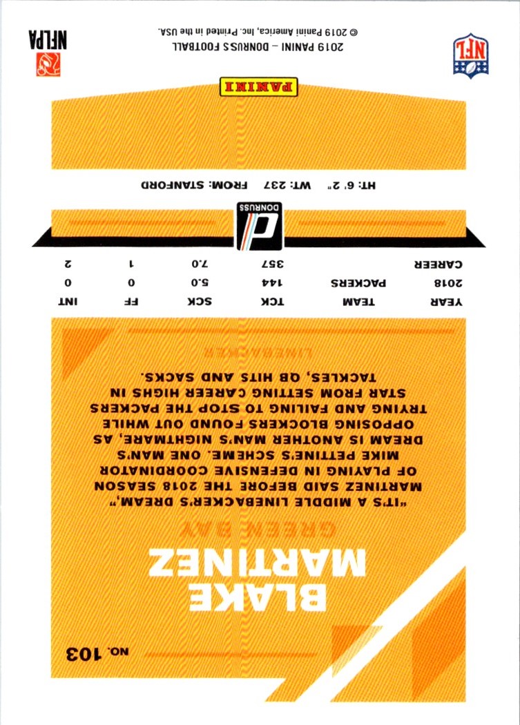 This 2019 Donruss Blake Martinez #103 card is a must-have for all Green Bay Packers fans! Show your team spirit and add this card to your collection today! Featuring an action shot of Martinez in his Packers uniform, this card captures the intensity and excitement of the game. With bright colors and crisp details, this card is sure to make a statement in any collection. It's the perfect way to commemorate one of the team's most beloved players and show your support for the Packers!