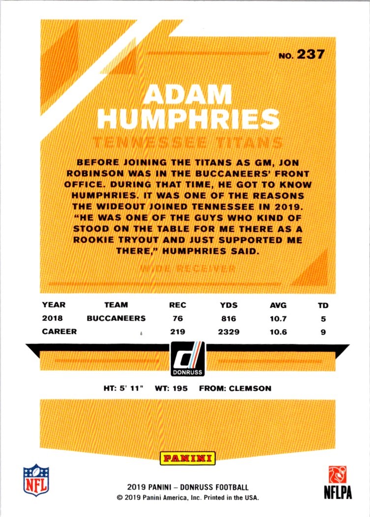 This 2019 Donruss Blue Press Proof Adam Humphries #237Tennessee Titans card is a must-have for any collector of NFL memorabilia. Featuring a unique, glossy finish, this card captures the excitement of the game and showcases the player in a vivid, vibrant hue. The card is an authentic representation of the Tennessee Titans and Humphries, and is sure to be a great addition to any collection. With a limited print run, this card is sure to be a conversation starter amongst fellow NFL fans and collectors alike. Get your hands on this card and show your support for the Titans and Adam Humphries!