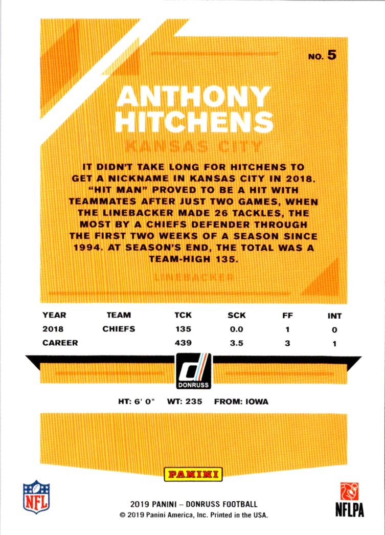Description: 2019 Donruss Blue Press Proof Anthony Hitchens #5
