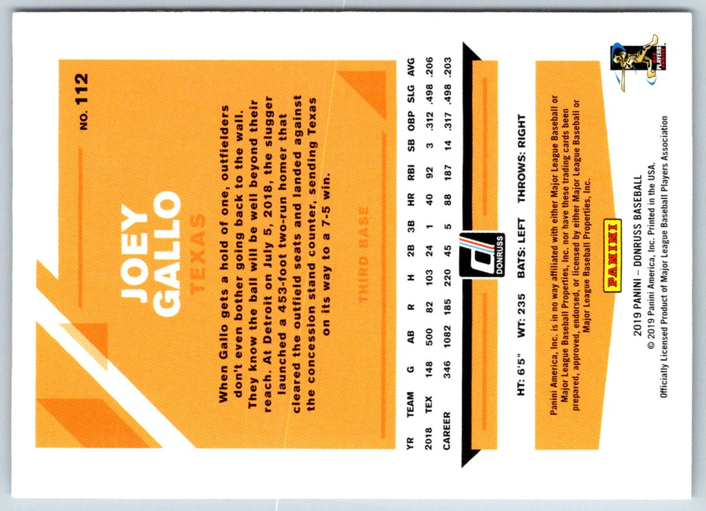 Joey Gallo is an up and coming star in the Major Leagues and this 2019 Donruss Career Stat Line card highlights his impressive career. This card features Gallo as a member of the Texas Rangers, with a full-color action shot of him on the field. The back of the card shows his career stats and highlights his important milestones. It's the perfect way to commemorate Gallo's impressive career and is a must-have for any Rangers fan or baseball collector. Get your Joey Gallo 2019 Donruss Career Stat Line card today!
