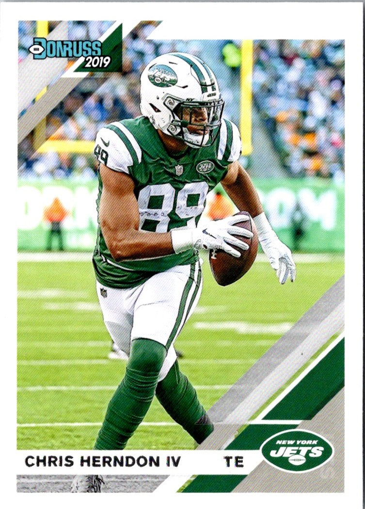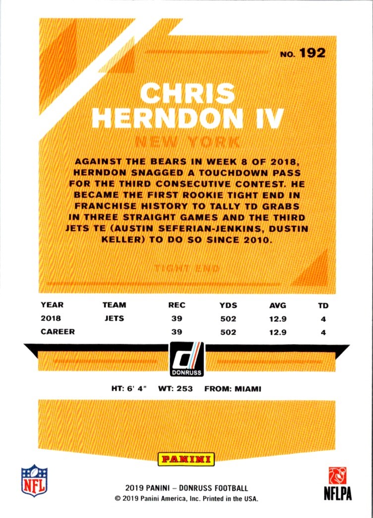 Chris Herndon IV #192 from the 2019 Donruss set is a must have for any New York Jets fan! This card features a vibrant image of the young tight end in his signature green and white uniform. His stats and team logo are also included on this card. Herndon has had a great start to his career and is sure to be an integral part of the Jets offense in the years to come! Add this card to your collection today and show your support for the New York Jets!
