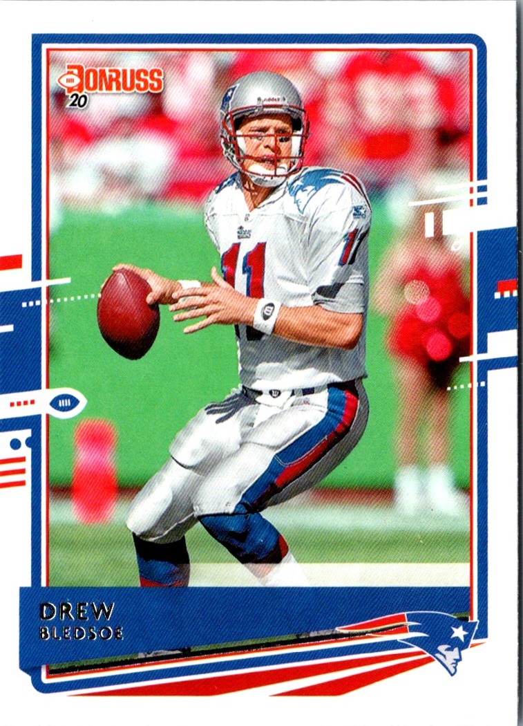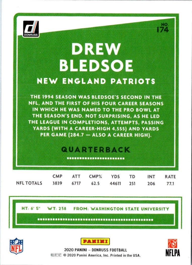 The 2020 Donruss Drew Bledsoe #174New England Patriots card is a must-have for any Patriots fan! This card features a full-color action photo of the legendary quarterback in his Patriots uniform, and his stats and bio on the back. It's the perfect way to commemorate the career of a Patriots legend. Add this card to your collection today and show your team pride!