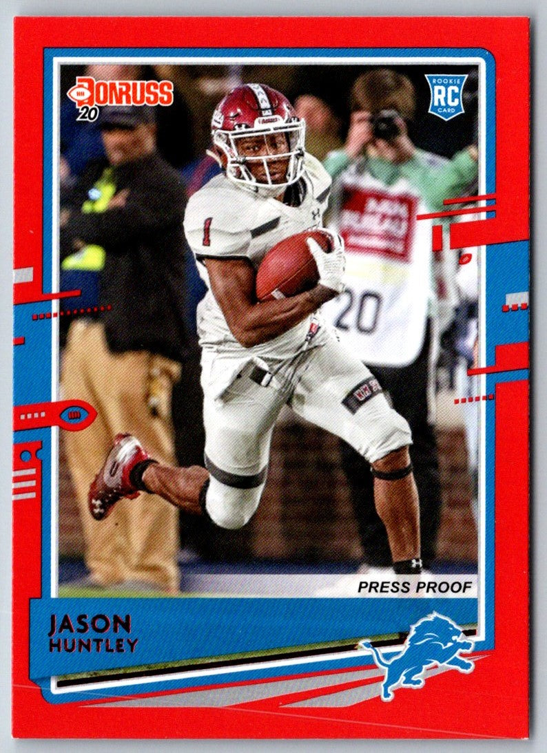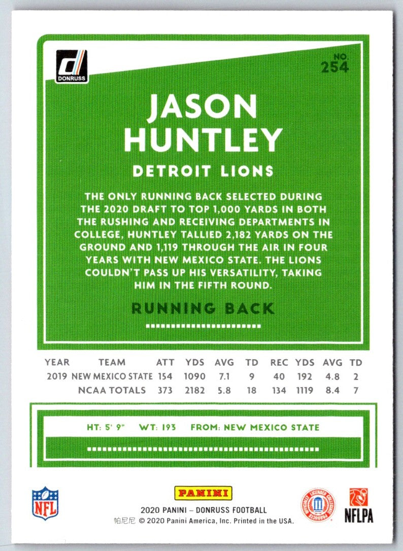 This 2020 Donruss Jason Huntley card #254 is a must-have for any Detroit Lions fan! It features a stunning image of Huntley in his Lions uniform with a dynamic design that will look great in any collection. The card also includes important stats and vital information about the young running back. This card is a great way to show your support for the Lions and to commemorate Jason Huntley's season with the team. This card is an essential piece for any Detroit Lions fan!