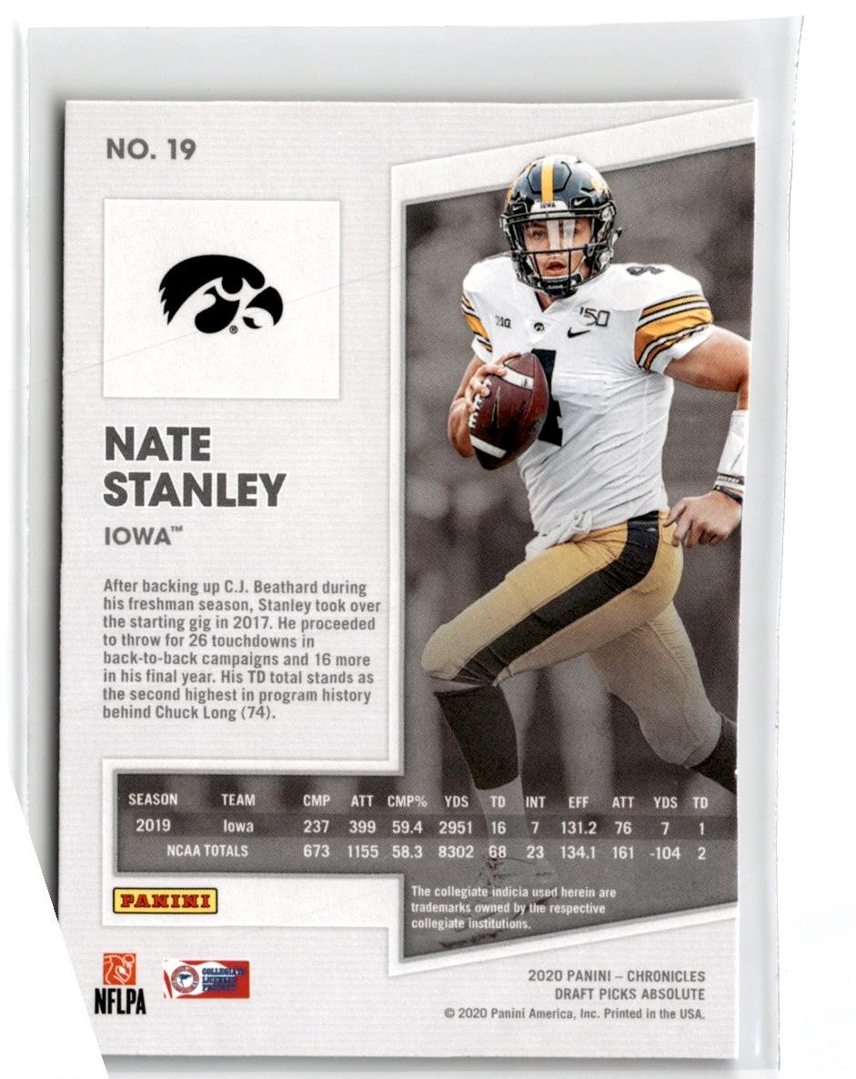 This 2020 Panini Chronicles Draft Picks Absolute Rookies Spectrum Nate Stanley #19 Iowa Hawkeyes card is perfect for any football fan! Featuring Stanley in his University of Iowa uniform, it's a great way to honor one of the greatest quarterbacks in college football history. With incredible detail and artwork, this card is sure to be a hit with any collector. The card is made from thick card stock and is sure to last for years to come. Add this card to your collection today and show your love for the Hawkeyes!