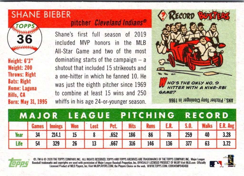 2020 Topps Archives Shane Bieber #36