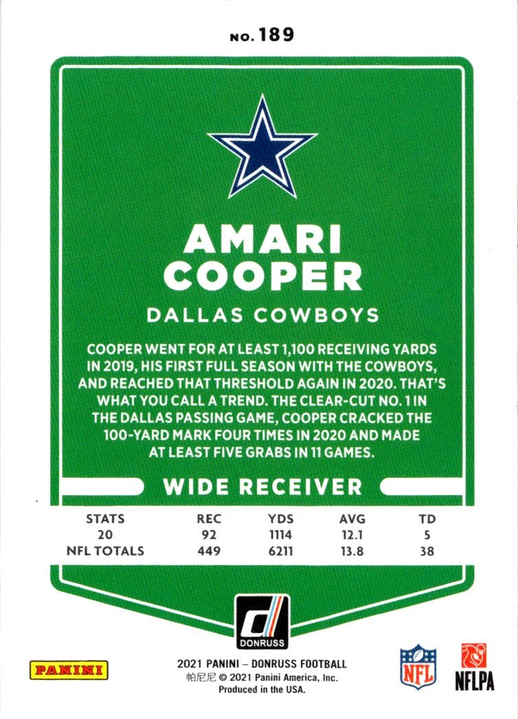 Donruss 2021 Amari Cooper #189 is a must-have for any Cowboys fan! This card captures the three-time Pro Bowl wide receiver in action with the classic Donruss design. Cooper is one of the most dominant players in the NFL, and this card is a perfect representation of his skill and talent on the field. Featuring Cooper surrounded by a brilliant blue foil, this card is sure to stand out in any collection. Add the 2021 Donruss Amari Cooper #189 to your collection today!
