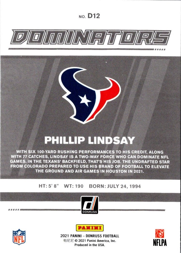 Description: 2021 Donruss Dominators Phillip Lindsay #D12