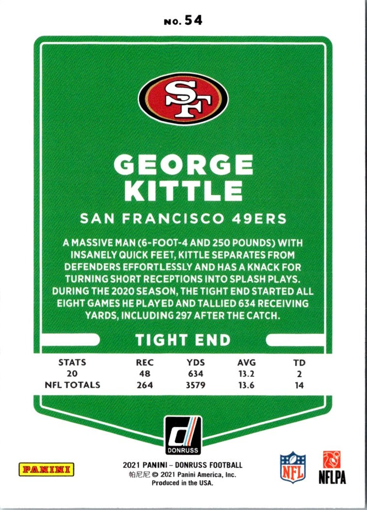 The 2021 Donruss George Kittle #54 San Francisco 49ers card is the perfect addition for any football fan's collection! This amazing card features a dynamic photo of Kittle in action, wearing the iconic 49ers uniform. The card also features a detailed biography of Kittle's storied career to date, along with his stats and accolades. This is the perfect card for any collector looking to commemorate the amazing career of one of the NFL's best players. Get your hands on this amazing card today and add it to your collection!