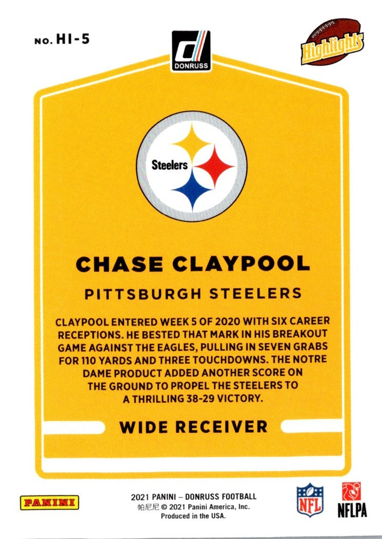 Introducing the 2021 Donruss Highlights Chase Claypool #HI-5! Show your support for the Pittsburgh Steelers and Chase Claypool with this awesome card! Featuring a bold action shot of Claypool in his Steelers uniform, this card is sure to be a great addition to any fan's collection. Get your hands on this card now and show your support for the Steelers and Claypool!