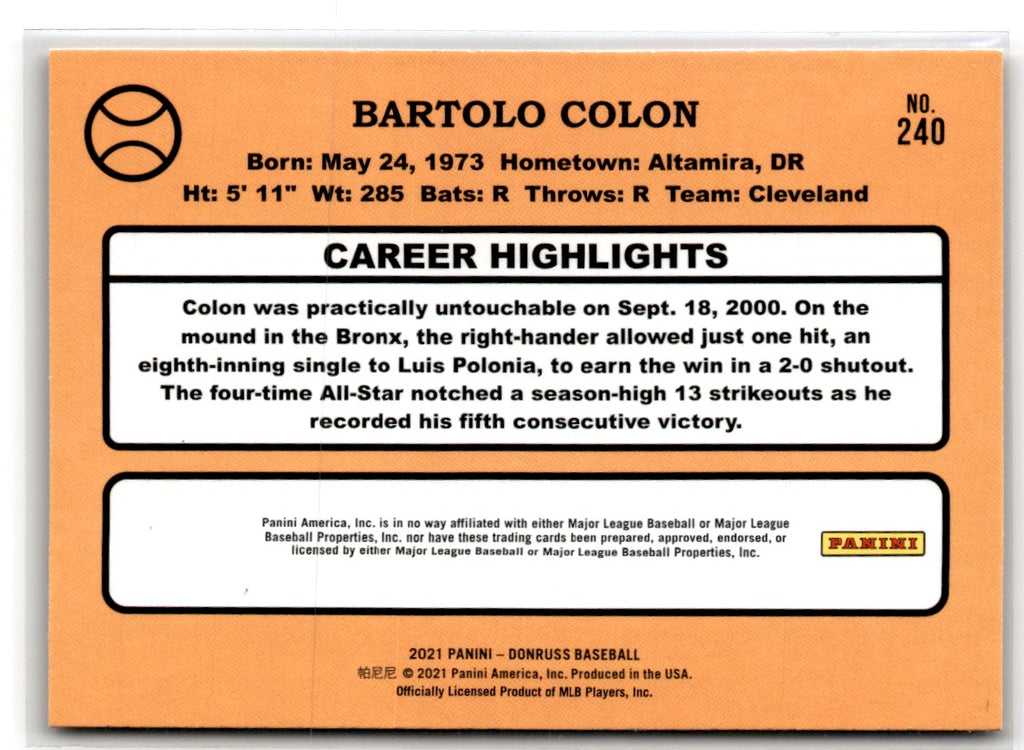 Description: 2021 Donruss Holo Orange Bartolo Colon #240A