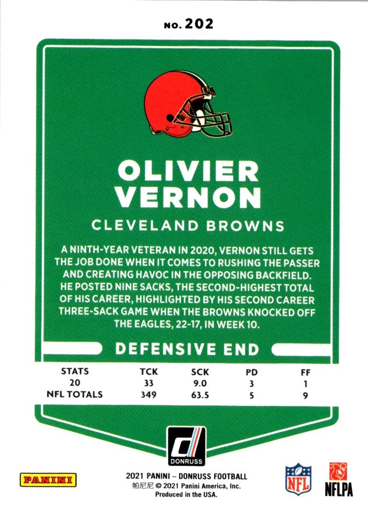 This 2021 Donruss Olivier Vernon card features the defensive end in his new Cleveland Browns uniform. This card displays an action-packed image of Vernon ready to make a play. It includes detailed card stats and career highlights making it a must-have for any football fan. Add this card to your collection and show your support for the Cleveland Browns.