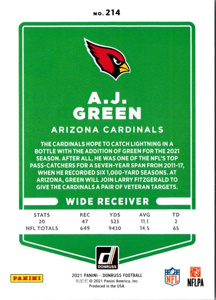 Description: 2021 Donruss Press Proof Blue A.J. Green #214