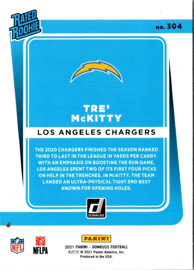 This 2021 Donruss Tre' McKitty #304 card from the Los Angeles Chargers features a stunning image of the tight end in full color. The card showcases McKitty's career stats, and his name and team logo are printed in bold lettering. As a part of the 2021 Donruss set, this card is sure to become a collector's favorite. With its sharp design, this card is perfect for any Chargers fan or collector looking to add to their collection. Grab it while supplies last!