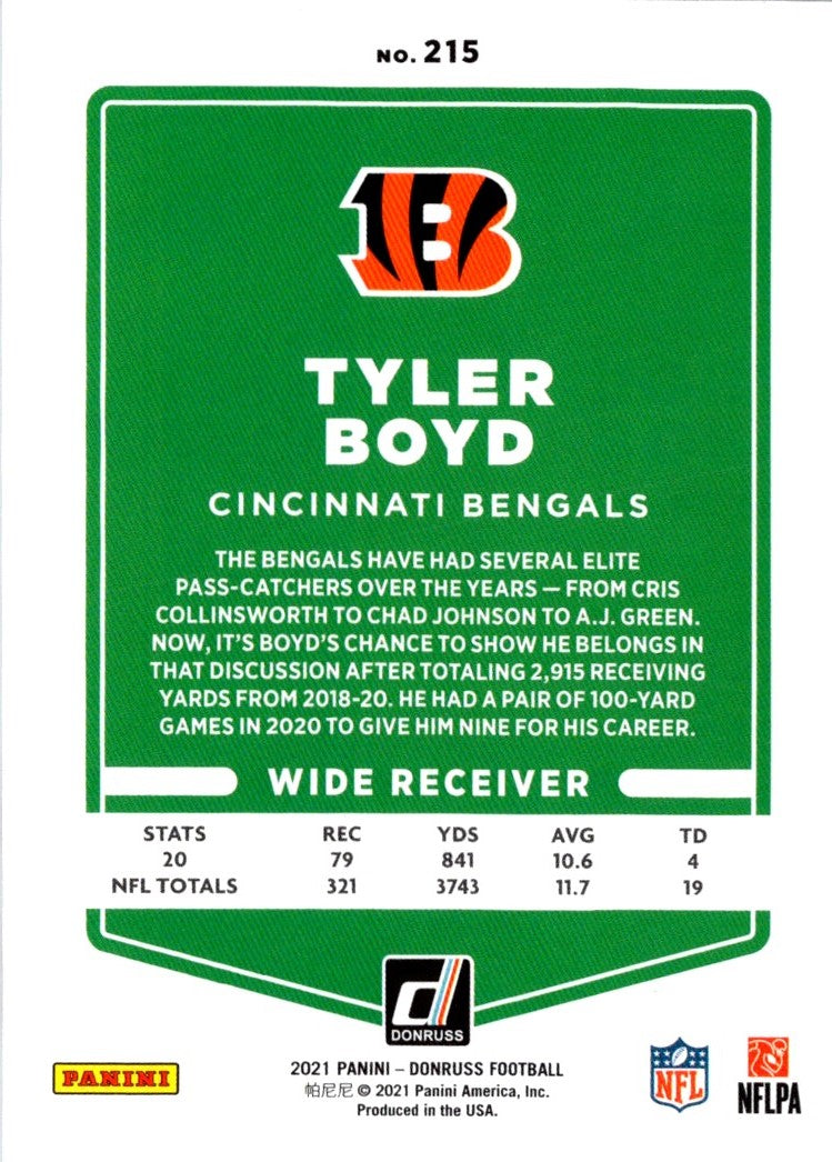 This 2021 Donruss card celebrates the great Tyler Boyd of the Cincinnati Bengals. It features a bold image of Boyd, and captures the energy and excitement of the Bengals' offense. The back of the card includes a detailed profile, including stats, highlights, and a brief biography. It's a must-have for any Bengals fan, or NFL card collector. Get your hands on this one-of-a-kind card before it's gone!