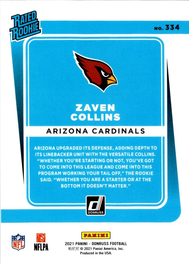 This 2021 Donruss Zaven Collins #334 Arizona Cardinals card celebrates the standout rookie linebacker with a bold design. It features a stunning full-color action shot of Collins in his Cardinals uniform, along with his vital stats and team logo. This card is perfect for any fan of the Cardinals, or any collector of football memorabilia. It’s a must-have for any collection!