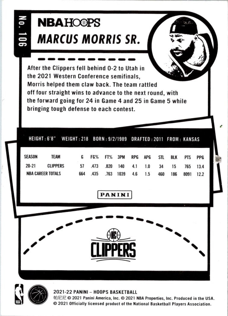 Description: 2021 Hoops Red Backs Marcus Morris Sr. #106