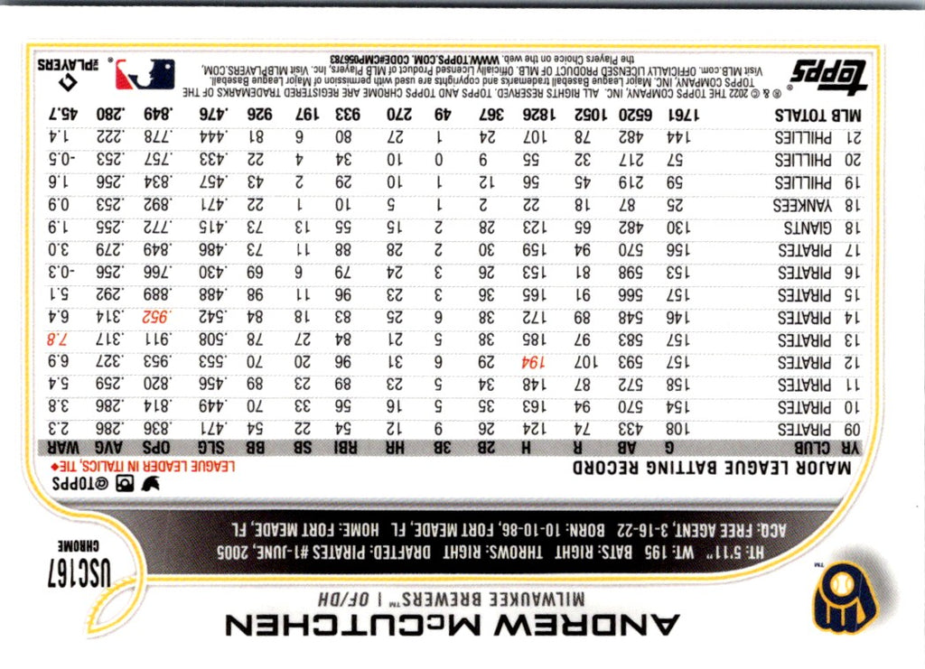 Description: 2022 Topps Chrome Update Andrew McCutchen #USC167