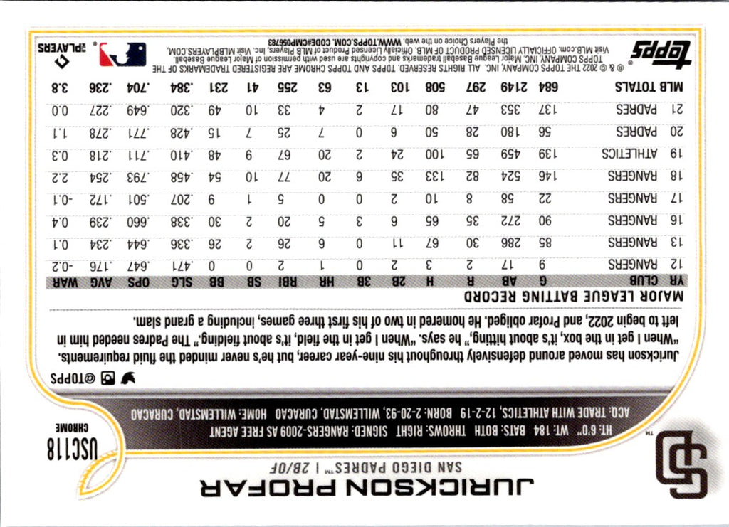 Description: 2022 Topps Chrome Update Purple Refractor Jurickson Profar #USC118