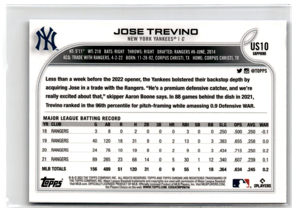 Description: 2022 Topps Chrome Update Sapphire Edition Jose Trevino #US10