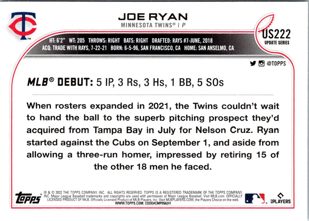 Description: 2022 Topps Update Joe Ryan #US222